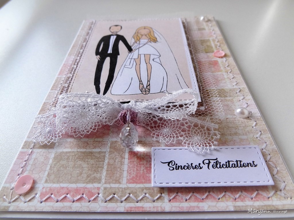 J'aime beaucoup ta carte et souhaite beaucoup de bonheur à ce jeune couple qui me paraît bien sympathique. C'est un thème que je n'aborderai plus car j'ai pris une "bonne gifle" cette année pour celui de mon aînée. J'avais de très beaux tampons que je vais vendre ou offrir lors d'un jeu... Un choix de papiers, embellissements et illustration qui démontrent ton talent et ta minutie. Bisous