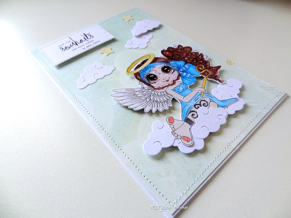 RépondreSupprimerTa carte est adorable et je l'aurai aimée aussi ! Le personnage est mignon, bien colorié, un ange avec des yeux superbes et le décor est bien choisi aussi pour le mettre en valeur. Bravo pour cette jolie réalisation. Bisous